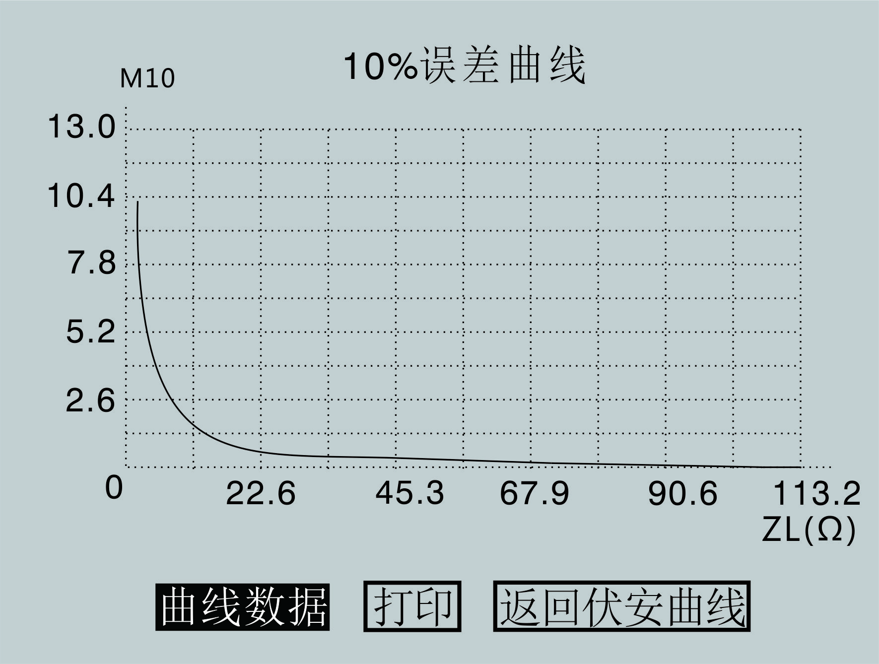 操作旋转鼠标将光标移动至曲线数据选项并按下,可显示10%误差曲线的曲线数据,如图3.11所示,通过旋转鼠标将光标移动至打印选项并按下,可打印10%误差曲线,通过旋转鼠标将光标移动至返回伏安曲线选项并按下,可自动返回到上一级伏安特性试验结果操作界面。