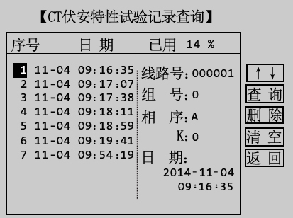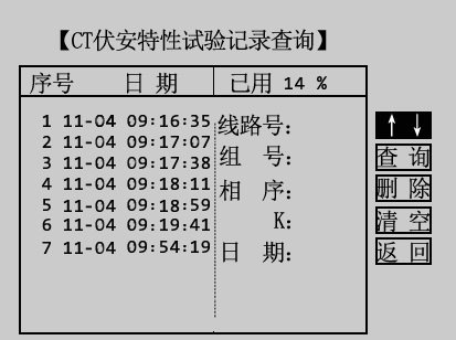 本仪器可以由用户根据实际需要来保存CT伏安特性试验结果。在图3.2所示界面,通过旋转鼠标将光标移动至记录查询选项并按下,即可进入CT伏安特性试验记录查询界面,如图3.14所示。