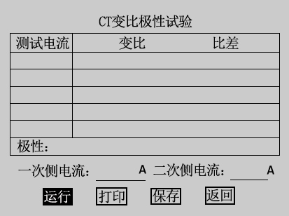 在CT测试主界面中光标选择极性测量选项,点击旋转鼠标进入CT极性测量界面如图3.22所示。CT极性试验接线与CT变比极性试验接线方式相同,按下运行后,仪器会自动检测所连接CT的极性。选择打印选项则将试验结果打印,选择返回选项则返回至CT试验主界面。