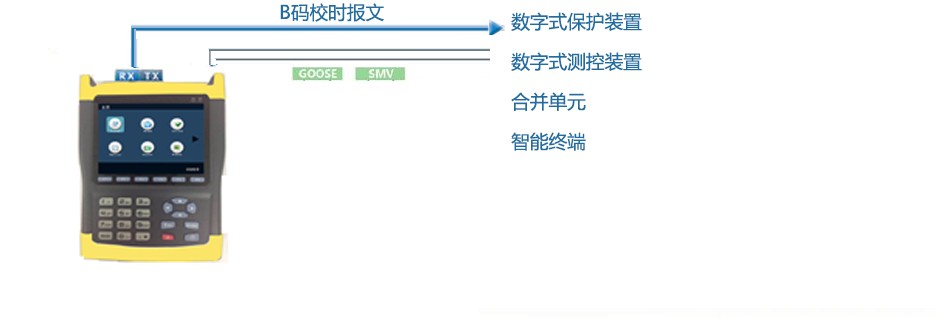 此功能仪器会输出 B 码校时报文供给数字式保护设备、数字式测控设备、 合并单元、智能终端,同时分析接入到设备的 SMV、GOOSE 报文,检测各报文的 同步位,用以测试数字式测试仪的校时同步逻辑。