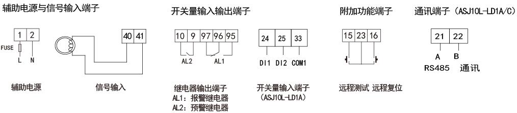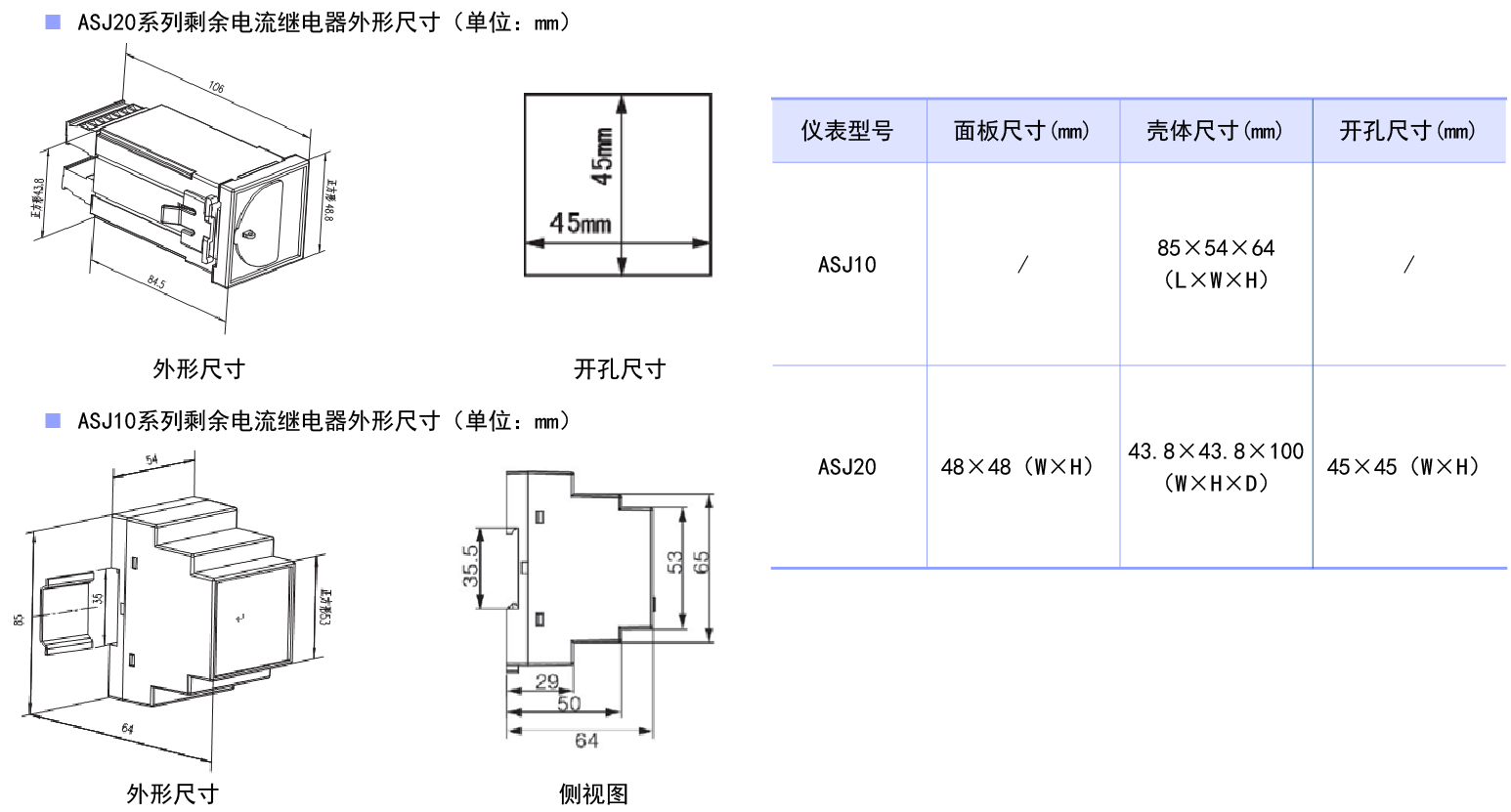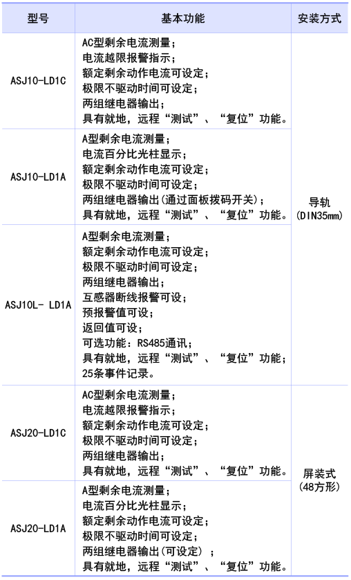 注:ASJ10L额定剩余动作电流10mA-30A连续可调;极限不驱动时间0-10S连续可调。