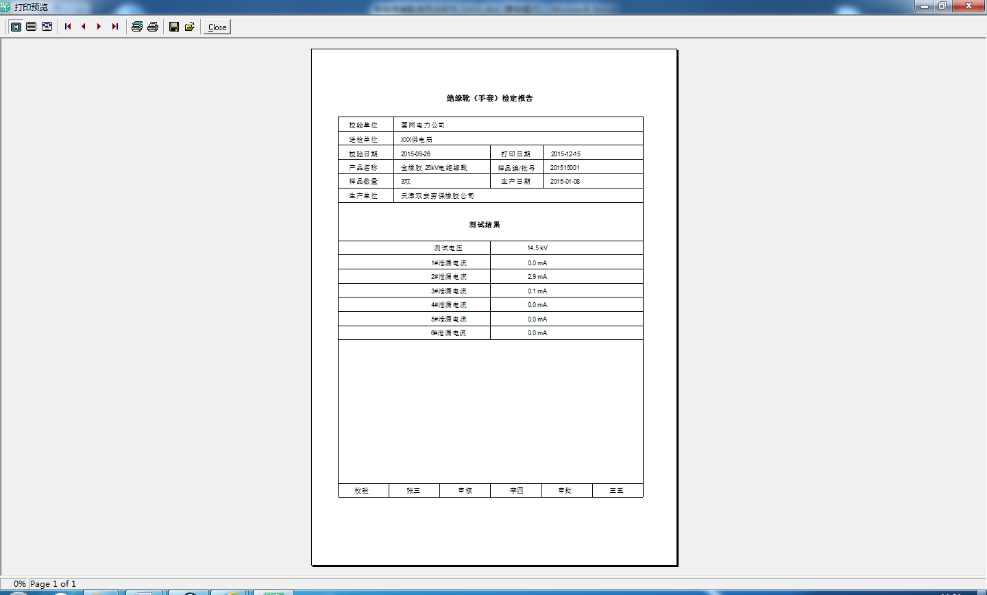 按钮就可以进入生成报表界面,如图5.5所示,在对应的空白处可以填入相应的内容,然后点击确认按钮,就可以生成对应格式的报告,同时进入到打印预览如图5.6所示。此时可以直接点击打印,打印出对应格式的报告,或者点击保存,将报告进行保存。