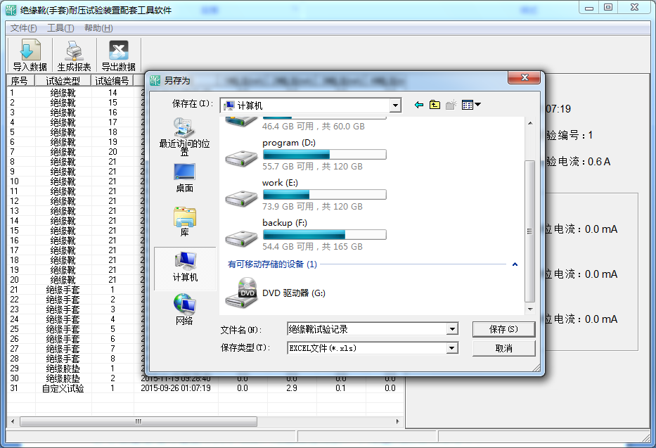 按键,即可将所用试验数据导出为xls格式的文件,如图5.7所示,在这里选择要保存导出数据文件的位置,并对保存文件进行命名后,即可对所有试验数据进行长期保存备份。