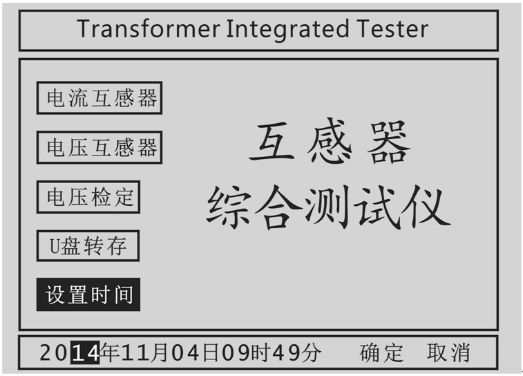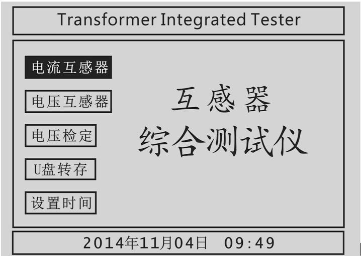 首先将AC220V或AC380V电源连接至仪器面板,打开面板上主电源开关,仪器进入开机画面,开机完成后仪器显示如图2.1所示画面,进入待机画面后光标指示的当前试验项目为电流互感器,当前选择项目的背景会反色。按下旋转鼠标即可进入电流互感器测试界面,转动旋转鼠标则可选中电压互感器、电压检定、U盘转存或设置时间。