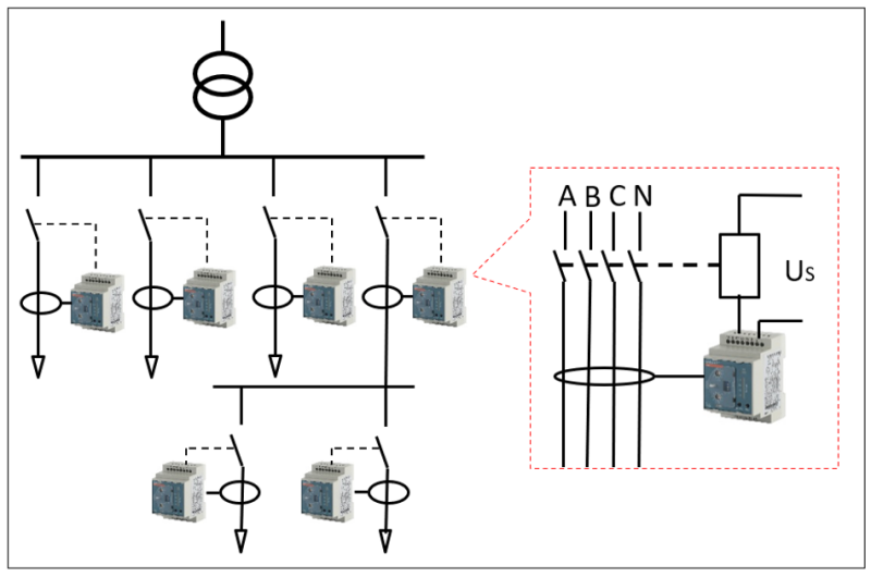 实际应如图所示,互感器安装在主回路或者支路上,通过测量剩余电流判断是否驱动断路器动作。