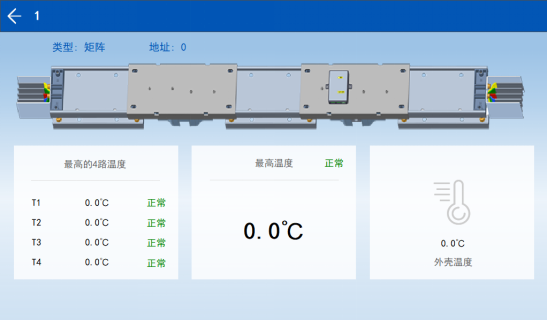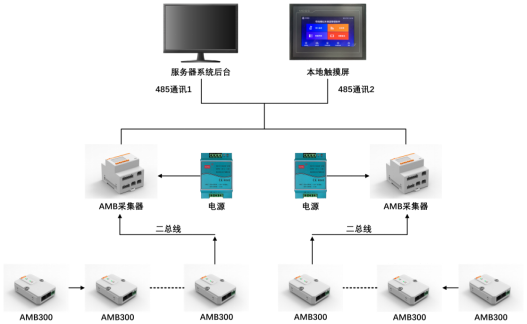此母线槽红外测温解决方案由人机HMI触摸屏,红外测温模块,红外采集器,电源模块组成。该系统通过RS485线与本地触摸屏和后台监控进行通信(如下图),系统设计遵循际标准Modbus-RTU传输规约,安全性、可靠性和开放性都得到了很大地提高。RS-485作为一种串行通信的接口具有传输距离长、速度较高、电平兼容性好、使用灵活方便、成本低廉和可靠度高等特点,与无线通信方式相比,具有价格低、抗共模干扰能力强等优点。
