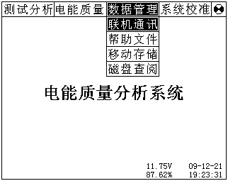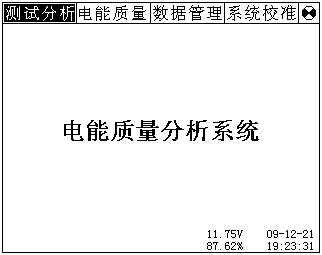 当开机后显示图三界面。屏幕顶端一行显示为各项功能菜单,包括四个选项:测试分析、电能质量、数据管理、系统校准;选择←、→键,用于改变当前选项;选择↓键或确认键,显示对应的下拉菜单,按确定键进入相应功能测试和设置;屏幕右下角显示出内置充电电池的电压幅值和剩余电量百分比,用户可根据此数值来判断是否需要为仪器充电;最右侧显示出当前实时的日期和时间。右上角为锁定/刷新指示,当图标转动时表示正常刷新,图标固定不变时表示在锁定状态。(其它屏于此屏相同,不再一一介绍)