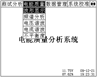 测试分析下拉菜单如图五所示,其中有五个功能选项,分别为:波形显示、频谱分析、电压谐波、电流谐波、不平衡度;按↑↓键可改变当前选中的项目。