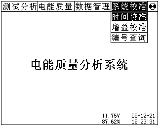 系统校准下拉菜单如图七所示,其中有三个功能选项,分别为:时间校准、增益校准、编号查询;按↑↓键可改变当前选中的项目。