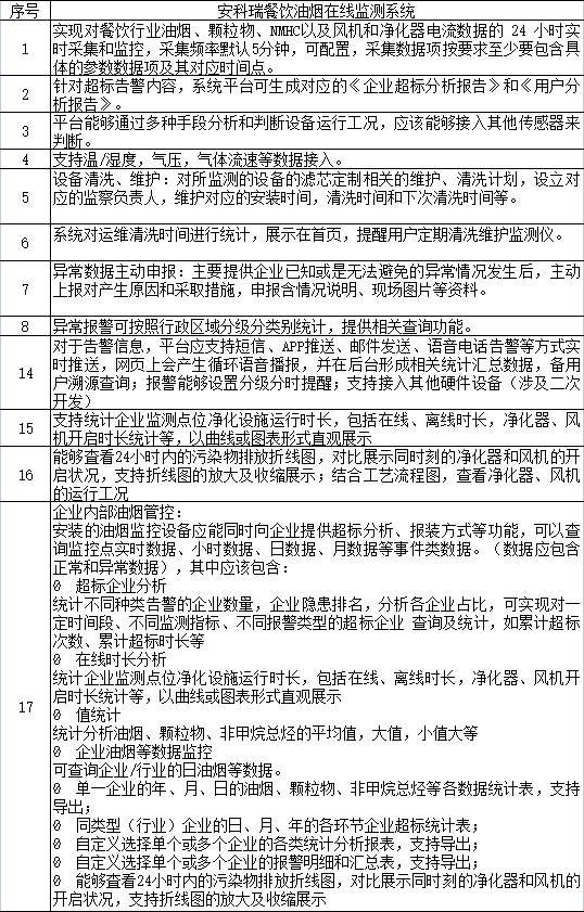 项目配置餐饮油烟在线监测系统、油烟浓度在线监控仪以及电流互感器,对实现对餐饮行业油烟、颗粒物、NMHC以及风机和净化器电流数据的 24 小时实时采集和监控。
