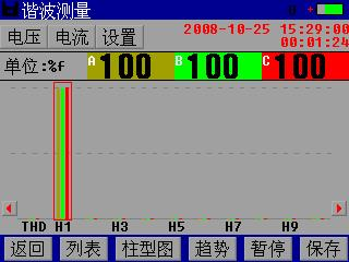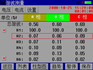 谐波测量功能可测量三相四线电系统的各相电压、电流的1~50次谐波失真百分比。