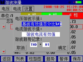 点击设置键,可选择谐波测量结果表现形式:%r(以各次谐波有效值与总有效值的比值作为谐波失真百分比)、%f(以各次谐波有效值与基波有效值的比值作为谐波失真百分比)或显示谐波电压/谐波电流的有效值;选择要记录趋势的任意两次谐波(包括总谐波失真)。如图2-3。点击确定键使用设定设置,各设定值由相应的列表框取值决定。点击取消键放弃本次操作。