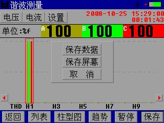 点击保存键弹出保存选择界面,选择“保存数据”可保存当前测量数据,选择“保存屏幕”可以图片方式保存当前显示界面。谐波测量数据都保存在HAR00001.PQD中。