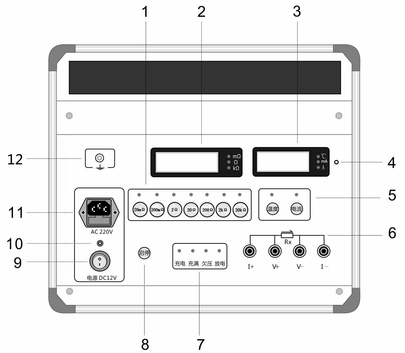 1、电阻量程选择键 | 2、电阻显示 | 3、温度/电流显示 |