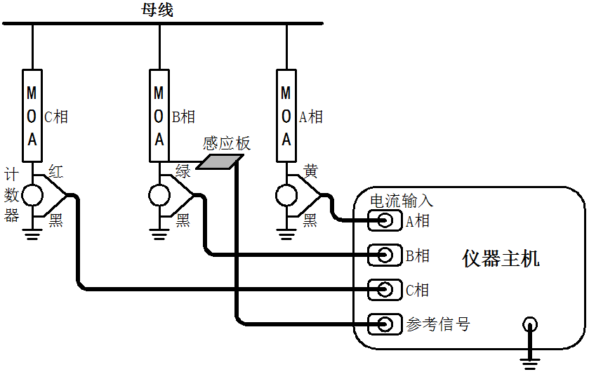 感应测试方式不需要电压采集器,仪器主机完成电流采样和感应电场采样。感应板应放置在B相避雷器底座上,放置位置应与A、C相避雷器对称,并且感应板与B相避雷器垂直;接线示意图见图20所示。