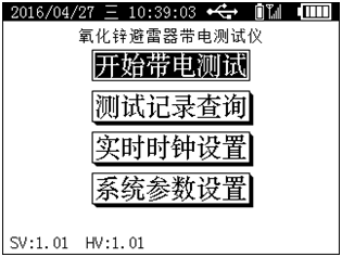 “主菜单”屏幕见图7所示。顶部状态栏显示当前日期、时间、优盘插入状态、测试方式(及相应附加信息)和仪器主机电池电量;底部显示软件版本号、硬件版本号和装置编号;中间为仪器型号名称以及可选的功能菜单。