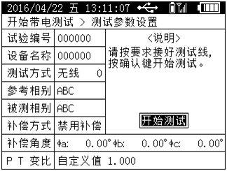 在“主菜单”屏幕中选择“开始带电测试”按“确认”进入“测试参数设置”屏幕,见图8。