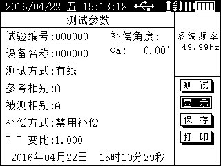 ● 补偿角度:在此处可以查看或者设置A、B、C三相的补偿角度;单相测量时,只显示被测相别的补偿角度。
