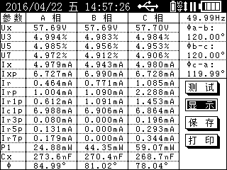 ● 三相电压夹角:三相同时测量时,显示三相电压夹角Φa-b、Φb-c、Φc-a;单相测量时,不显示。