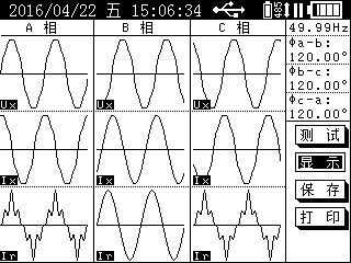 ABC表示三相同时测量,在ABC(黄、绿、红)三相电流通道同时输入三相电流。