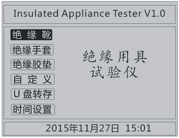 首先将AC220V电源连接至仪器面板,打开面板上主电源开关,仪器进入开机画面,开机完成后仪器显示如图2.1所示画面,进入待机画面后光标指示的当前试验项目为绝缘靴,当前选择项目的背景会反色。按下旋转鼠标即可进入绝缘靴测试界面,转动旋转鼠标选中