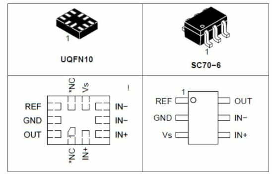 NCS21xR 和 NVC21xR IC 提供两种配置封装,SC70-6 和 UQFN10,如图所示。