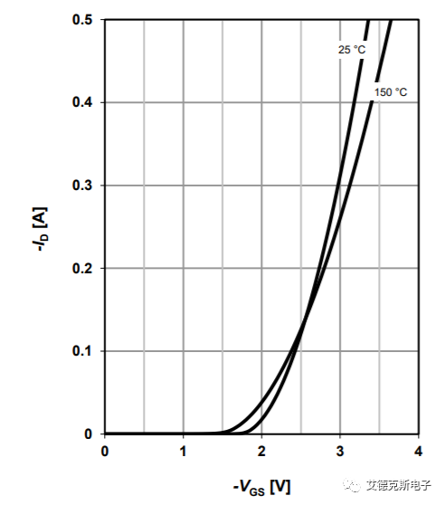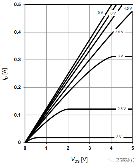 转移特性是验证的是栅极电压VGS对ID的控制作用,其表征了器件的放大能力。对于恒定的VDS,VGS越大,则沟道中可移动的电子越多,沟道电阻越小,相应的ID就越大。当然这个VGS达到一定值的时候,电压再大,ID也不会再有太大的变化了。以某品牌MOSFET参数为例,其转移特性曲线如下图所示:
