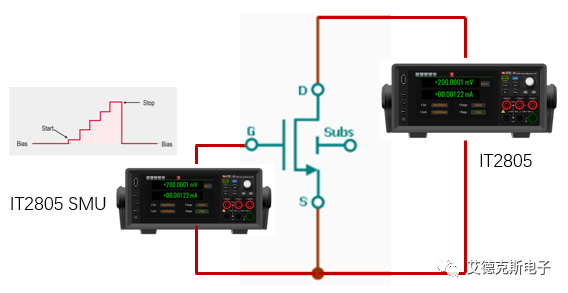 测试方法:如上图,在漏极D和源极S之间连接SMU1-IT2805(200V/1.5A/20W),施加特定的VDS值。接着通过SMU2-IT2805扫描VGS,并同步量测ID,随着VGS的增大,ID也会增大,最终绘制出曲线。