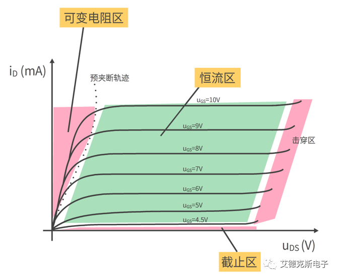 MOS管的输出特性可以分为三个区:截止区、恒流区、可变电阻区。当MOSFET工作在开关状态时,随着VGS的通/断,MOSFET在截止区和可变电阻区来回切换。当MOSFET工作于恒流区时,可以通过控制VGS的电压来控制电流ID。