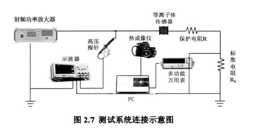 图2.7为测试系统连接示意图,放电电压的监测是通过衰减比1000:1的高压探针连接至示波器,记录放电波形和数据,并最终回传至电脑存储。电流的监测是通过测量1kΩ标准电阻两端电压,经过计算获得。在放电实验中,分别使用高压直流电源和射频电源。其中,高压直流电是由输出较小的信号发生器电压经功率放大器放大后得到。