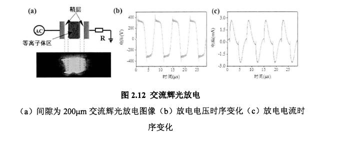 交流辉光放电过程相对直流放电更为复杂,放电不断经历着熄灭、维持和再击穿的过程。交流辉光放电图像及电压、电流的波形如图2.12所示,放电区间被分为两个部分:鞘层和等离子体区。