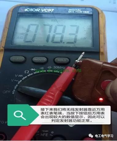 ②、同样使用万用表该档位,我们还可以鉴别电动门、行车等无线遥控发射器性能是否正常。具体方法如图所示,注意该过程中万用表黑表笔处于悬空无输入状态。