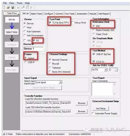 接着就是设置DUT类型、速率、夹具和测试分析模式,由于DUT是device,所以在Device一栏选择Device;USB3.0的速率为5G;测试的夹具分为了两类,一类是USB-IF协会的,另一类就是keysight(Agilent)的,在这里选择的是keysight(Agilent)的测试夹具;另外一个非常关键的点就是Test Method,是否选用USB-IF SigTest的分析方法,通常,我们会选择使用;选择参考时钟,一般高速串行信号都会选用SSC模式;还要根据产品使用。