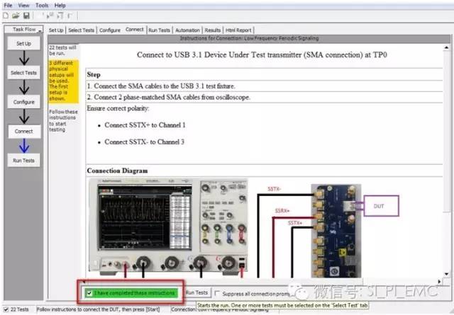 连接测试系统,包含示波器、夹具和DUT。测试软件会指示工程师的每一步连接,连接完成后,这里要注意,在连接完成之前,左下角的颜色是黄色的,连接完成之后,勾选’ I have completed theseinstructions’,就会变成绿色。如下两图所示: