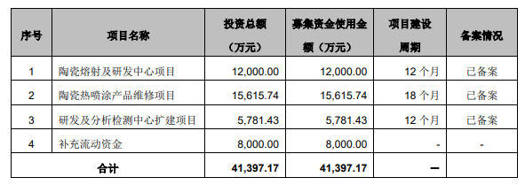 富乐德上市拟募资4.14亿元,用于“陶瓷熔射及研发中心项目”、“陶瓷热喷涂产品维修项目”、“研发及分析检测中心扩建项目”及补充流动资金,投入募集资金分别为1.2亿元、1.56亿元、0.58亿元、0.8亿元。