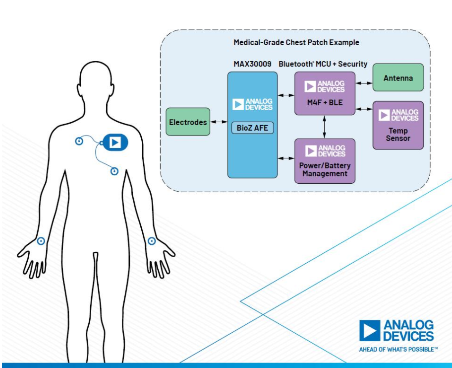 中国,北京 – 2022年3月9日 – Analog Devices, Inc. (ADI)日前推出低功耗、高性能生物阻抗(BioZ)模拟前端(AFE) MAX30009,旨在帮助缩小BioZ远程患者监测(RPM)设备的尺寸并延长设备的使用寿命。这款片上AFE为开发小尺寸、电池供电的可穿戴连续监测设备而设计,在监测健康状况的可穿戴设备和医用级贴片等应用中提供生物阻抗分析的临床级生命体征测量,以评估患者的健康状况。