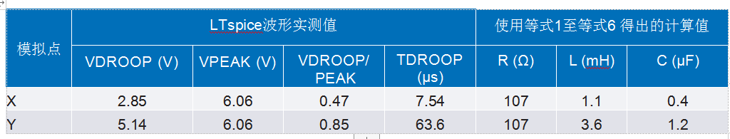 表1.下降分析:使用VDROOP/VPEAK和TDROOP测定电路电感和电容