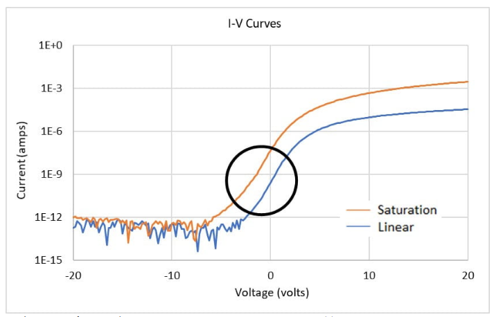 使用吉时利最新4211-SMUs测得的OLED的饱和和线性I-V曲线。
