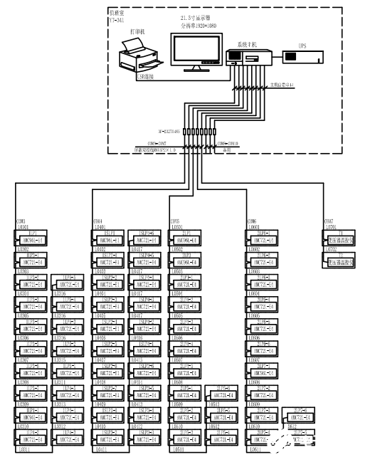 安科瑞Acrel-2000系统根据宝鸡大剧院配电室现场实际情况, 225台AMC系列多功能仪表采用屏蔽双绞线分12根总线接至配电室内的数据采集箱,再从采集箱通过五类八芯线连接至值班室内的工业网络交换机上,保障了配电室电力监控系统传输的稳定性与实时性。如下图所示: