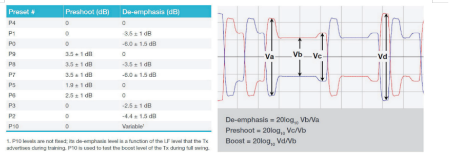 提交 PCI-SIG 认证的任何 PCIe 5.0 产品,都必须使用规定的 Tx 均衡器设置预置成功地通过一致性测试,支持速度从 2.5 GT/s 直到 32 GT/s。这些预置用来均衡码流内部的频率相关衰减差引起的码间干扰,改善了信号完整性。每个预置都是下冲 ( 光标前 ) 和去加重 ( 光标后 ) 的特定组合。
