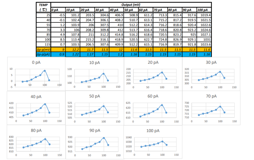 1. 常温25⁰C,0~100pA范围中步进为10pA的11个数据测试点和1个底噪数据点
