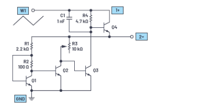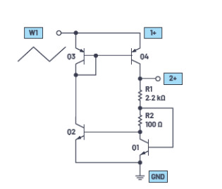 波形发生器1应配置为1 kHz三角波,峰峰值幅度为4 V,偏置为2 V。示波器通道2的单端输入(2+)用于测量Q4集电极上的稳定输出电压(负输入1-和2–应接地)。
