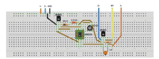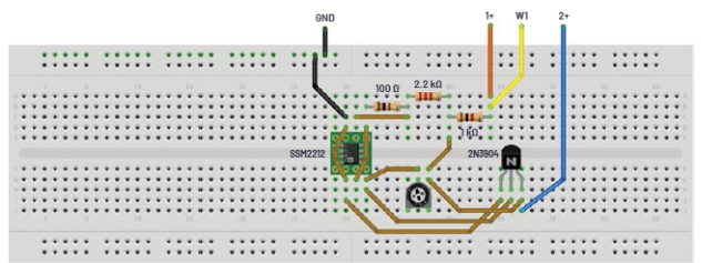 面包板连接如图4所示。晶体管Q1和电阻R1及R2依然配置为零增益放大器。晶体管Q2和可变电阻R3形成稳定的电流源。如果使用SSM2212匹配的NPN对,最好将其用于器件Q1和Q2。共发射极输出级Q3及其集电极负载R4提供增益。发射极跟随器Q4驱动输出节点并关闭负反馈环路。