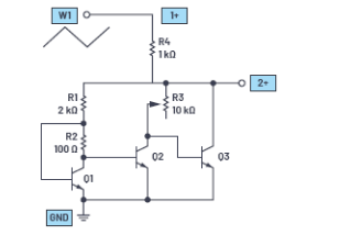 波形发生器W1应配置为1 kHz三角波,峰峰值幅度为4 V,偏置为2 V。示波器通道2 (2+)用于测量Q4发射极上的稳定输出电压。