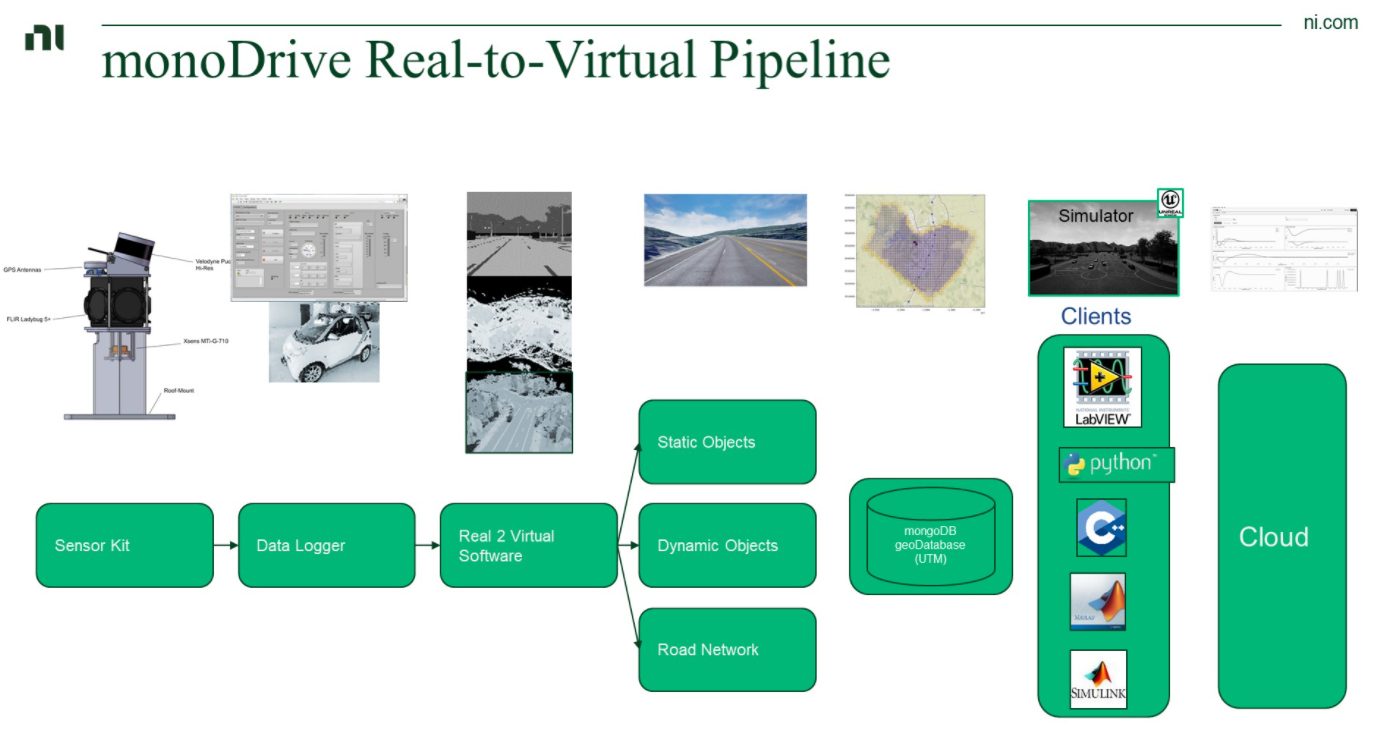数字孪生技术是建立虚拟场景库的利器,数字孪生指的是把真实的场景一比一的放在虚拟环境中,生成一个孪生系统。NI 近期收购了自动驾驶汽车开发的超高保真仿真软件的领导者monoDrive,利用monoDrive工具进行数字孪生,重构一个高保真度的场景。monoDrive可以把真实驾驶环境中的树叶、栏杆、地面上的标志图形完整地复现出来,甚至包括天气和路面积水情况,还原度非常高。