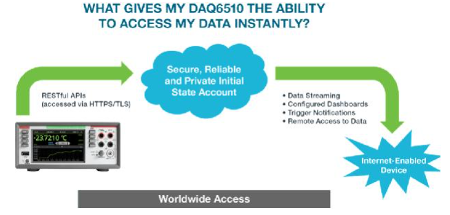吉时利和Initial State (均为泰克科技旗下公司)携手研制出市场上唯一的图形DAQ和DMM:Keithley DAQ6510和DMM6500,解决了这些问题。通过集成Initial State的云服务,您现在可以在全球传送数据,创建实时的可以简便配置的仪表板,创建触发/告警,把实时数据嵌入到任何网站中。所有这些功能不用电脑就能实现,只要您的DAQ/DMM和信宿设备(如手机或平板电脑)联网就可以了。您和您的团队可以减少在实验室中花费的时间,跳过Excel电子表格项目,减少完成项目所需的加班时间。