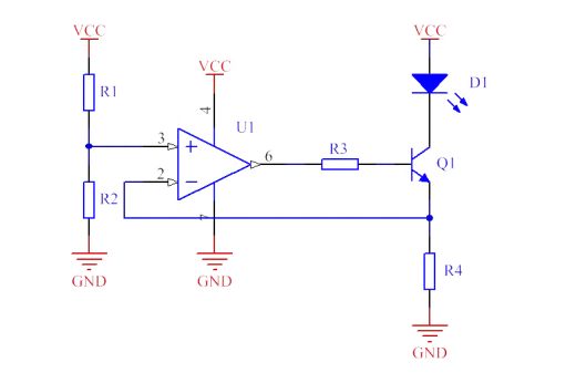 对于小功率的恒流源设计,最常用的就是运放 + 场管方案。电路如图2所示,该方案由分立元件组成,运放、三极管、电阻的电气参数一致性及温漂会极大的影响恒流源的精度,影响因素较多难以控制。