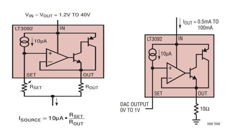ADI公司旗下有一款产品(型号:LT3092)单芯片集成了多个元件,使器件一致性和温漂更容易控制,成为恒流源方案的理想选择器件。最大输出电流200mA满足小功率恒流源的需求;超宽的输入电压范围及低压差工作电压(1.2V~40V)使得电源电压设计更具兼容性;内部更有高精度微恒流源(10uA),结合精密电阻可组成高精度的参考电压源。内部原理图如图3。