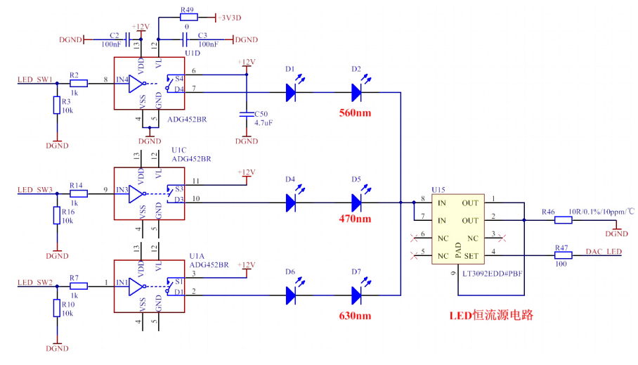 由于分光测色仪用到多个不同波长的LED,可以让每个LED配上一个恒流源,当然更好的方案是只用一个恒流源然后用模拟开关切换通道,这样更省成本。ADI公司有一款产品(型号ADG452)单芯片集成4通道模拟开关。较低的导通电阻(4Ω);每通道100mA的工作电流;快速的开关频率(tON = 70ns,tOFF = 60ns)。电气性能完全满足设计需求,方案电路实现如图5。