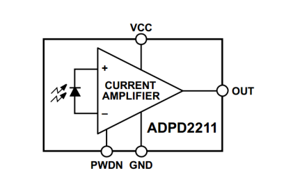 考虑使用多个高性能分立器件硬件成本过高,在性能达标的条件下可以尽量选择集成度高的器件。ADI旗下有一款产品(型号:ADPD2211),自带24倍电流放大器使之拥有超高的灵敏度,省去了外置运放;极好的脉冲响应(典型带宽达400KHz);超低电流噪声(90fA/√Hz)。其内部功能框图如图5。在输出端加上采样电阻到地,即可实现流压转换,省去众多的外围电路。其功能框图如图11。
